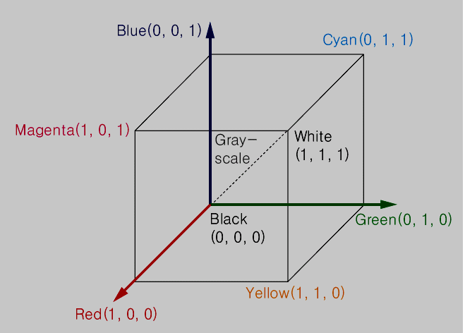 RGB μ»¬λ¬ λͺ¨λΈμ λΉ¨κ°, μ΄λ‘, νλμ΄λΌλ 3κ°μ§ μμ κ°μ μ΄μ©ν΄μ μμ ννν©λλ€.