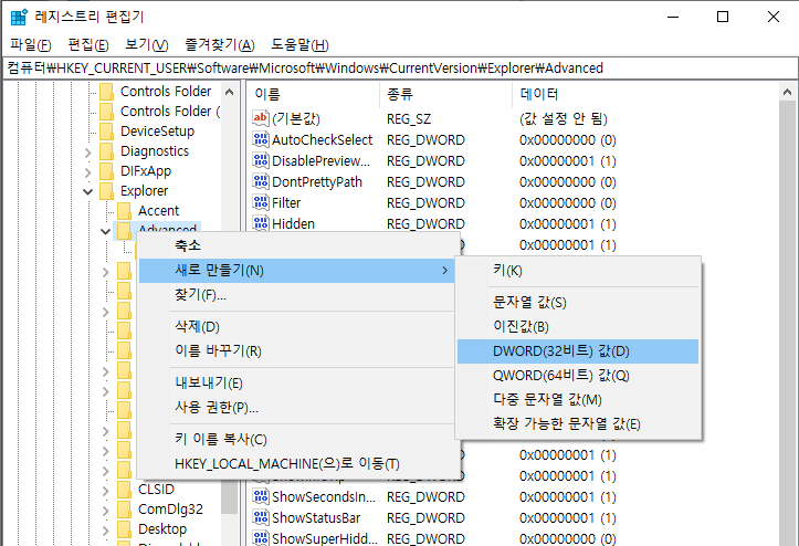 μ μ΄λ κ² μ λ ₯νμ ¨λ€λ©΄ μλ κ·Έλ¦Όμ²λΌ Advanced ν΄λλ₯Ό μ°ν΄λ¦νκ³ 'μλ‘ λ§λ€κΈ°' -> 'DWORD(32λΉνΈ) κ°'μ ν΄λ¦ν΄μ€λλ€.