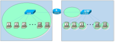 - ๋ฐ๋ผ์, 10Mbps์ ํ๋ธ์ ๋ง์ฝ 20๋์ PC๋ฅผ ์ฐ๊ฒฐํ๋ค๋ฉด ์ค์ ๋ก๋ 10Mbps๋ฅผ 20์ผ๋ก ๋๋ ๋งํผ์ ์๋๋ฅผ ๊ฐ์ ์ฌ์ฉ