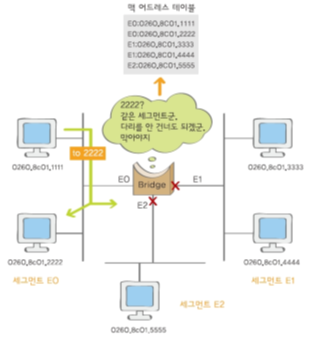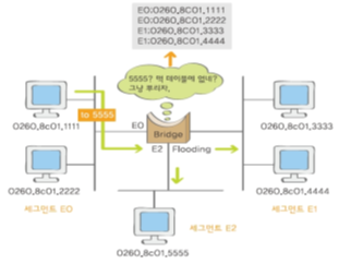 - ์ ๊ทธ๋ฆผ์ ์ธ๊ทธ๋จผํธ E0์ ์๋ MAC ์ฃผ์ 0260.8C01.1111์ ๊ฐ์ง PC๊ฐ MAC ์ฃผ์ 0260.8c01.2222๋ฅผ ๊ฐ์ง PC์ ํต์ ํ๋ ค๋ ๊ฒฝ์ฐ
