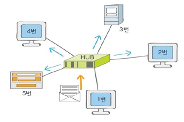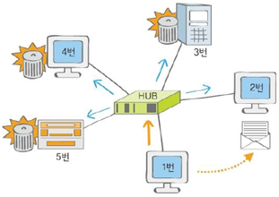 n 1) 1๋ฒ ํฌํธ๊ฐ ๋ฐ์ดํฐ๋ฅผ ํ๋ธ๋ฅผ ํตํด ์ ์กํ๋ฉด ํ๋ธ๋ ๋ฐ์ดํฐ๊ฐ ๋ค์ด์จ 1๋ฒ ํฌํธ๋ฅผ ์ ์ธํ๊ณ ๋๋จธ์ง ๋ชจ๋ ํฌํธ๋ก ๊ทธ ๋ฐ์ดํฐ๋ฅผ ๋ฟ๋ฆฌ๋ฏ๋ก 2๋ฒ๋ถํฐ 5๋ฒ๊น์ง ๋ชจ๋ ํฌํธ๋ก ๋ฐ์ดํฐ๊ฐ ๋ฟ๋ ค์ง๋ค.