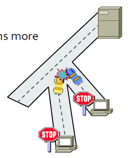 - ํ๋ ์์ด ๋คํธ์ํฌ ์์์ ๋ฌดํ์ ๋๊ธฐ ๋๋ฌธ์ ์ด๋๋ท์ ํน์ฑ์ ๋คํธ์ํฌ๊ฐ ์กฐ์ฉํด์ผ ๋ฐ์ดํฐ๋ฅผ ์ ์กํ ์ ์๋๋ฐ, ๋ค๋ฅธ PC๋ค์ด ๋คํธ์ํฌ๊ฐ ์กฐ์ฉํด์ง๊ธฐ๋ฅผ ๊ธฐ๋ค๋ฆด ๋ฟ ๋ฐ์ดํฐ ์ ์ก์ด ๋ถ๊ฐ๋ฅํ ์ํ