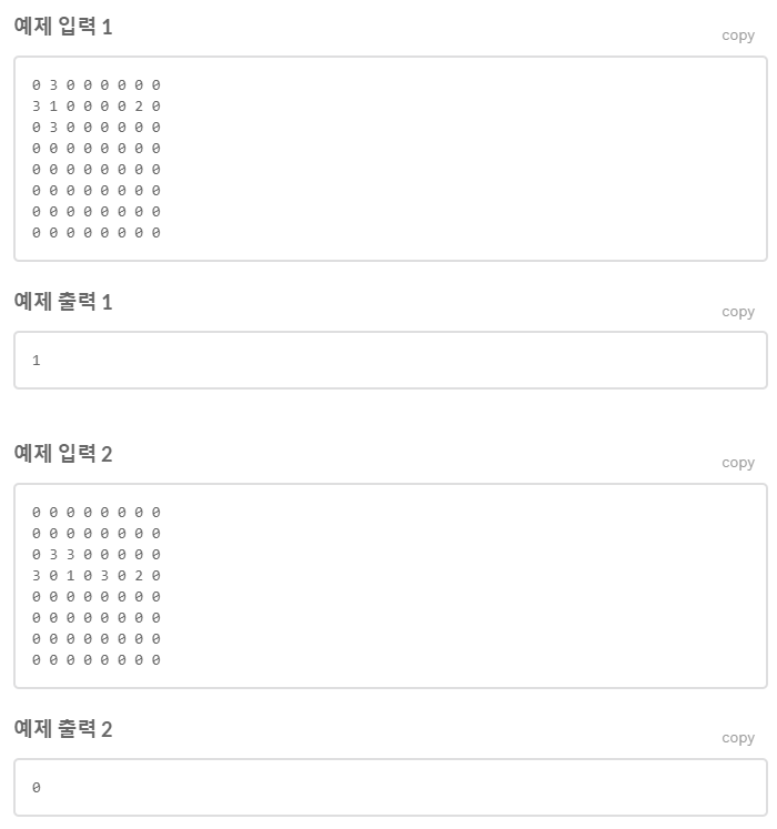 8쀄에 걸쳐 8x8 체슀판의 μƒνƒœκ°€ μ£Όμ–΄μ§„λ‹€. μ΄λ•Œ 0은 기물이 μ—†λŠ” μƒνƒœμ΄κ³ , 1은 μ•Œλž©μ΄μ˜ 킹을 μ˜λ―Έν•˜κ³ , 2λŠ” μƒλŒ€μ˜ 룩을 μ˜λ―Έν•˜λ©° 3은 κ·Έ μ™Έ λ‹€λ₯Έ 기물듀을 μ˜λ―Έν•œλ‹€. (킹은 ν•˜λ‚˜λ§Œ μ‘΄μž¬ν•˜λ©°, μƒλŒ€μ˜ 룩은 μ΅œλŒ€ 2κ°œκΉŒμ§€ μžˆμ„ 수 μžˆλ‹€. κ·Έ μ™Έ 기물듀은 μ΅œλŒ€ 29κ°œκΉŒμ§€ μžˆμ„ 수 μžˆλ‹€.)