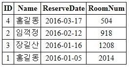 λ€μ μμ λ Reservation ν μ΄λΈμ λͺ¨λ λ μ½λλ₯Ό ReserveDate νλμ λ΄λ¦Όμ°¨μμΌλ‘ μ λ ¬νμ¬ μ ννλ μμ μ λλ€.