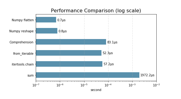 ์๋๋ ๊ฐ ๋ฐฉ์์ ๋ํ ํผํฌ๋จผ์ค(์ฑ๋ฅ) ์ฐจ์ด๋ฅผ ๋ณด์ฌ์ค๋ค. (์ถ์ฒ : winterj.me/list_of_lists_to_flatten/)